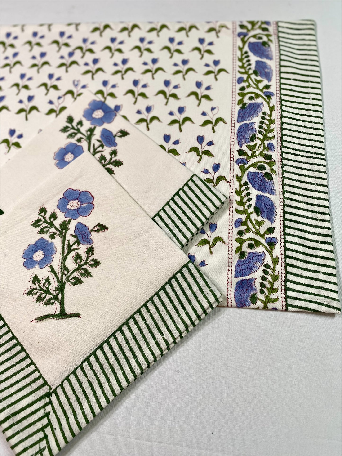 Hand block printed white and blue placemats with matching napkins